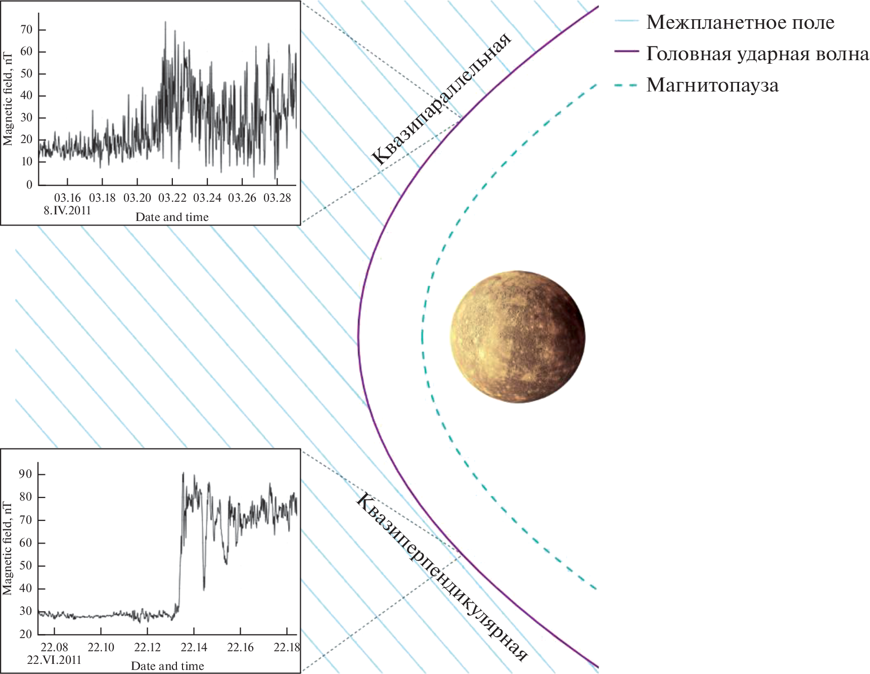 - Winslow R.M., Anderson B.J., Johnson K.L. et al. Mercury’s magnetopause and bow shock from MESSENGER Magnetometer observations // J. Geophysical Research: Space Physics. 2013. V. 118. Iss. 5. P. 2213–2227. https://doi.org/10.1002/jgra.50237