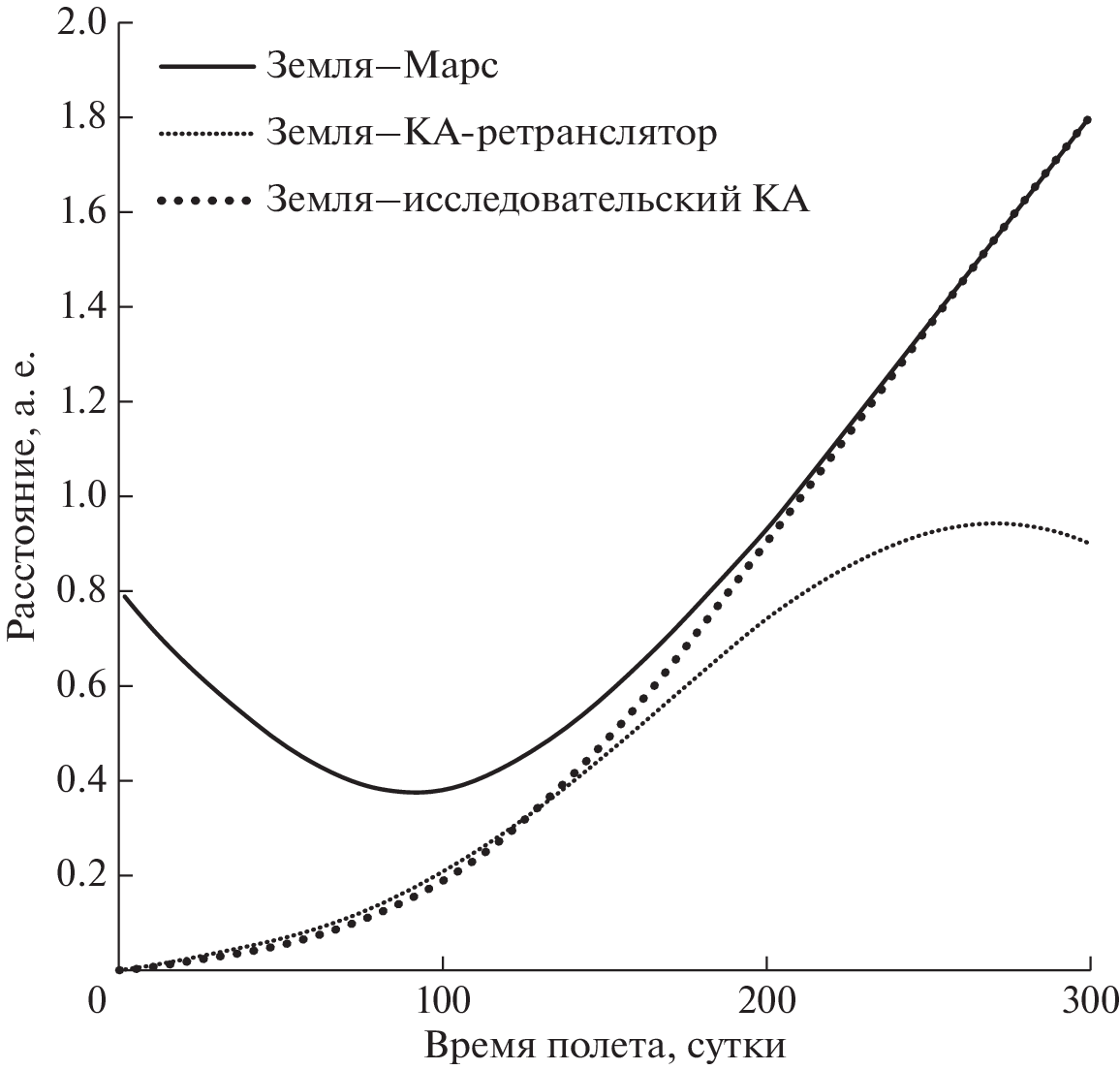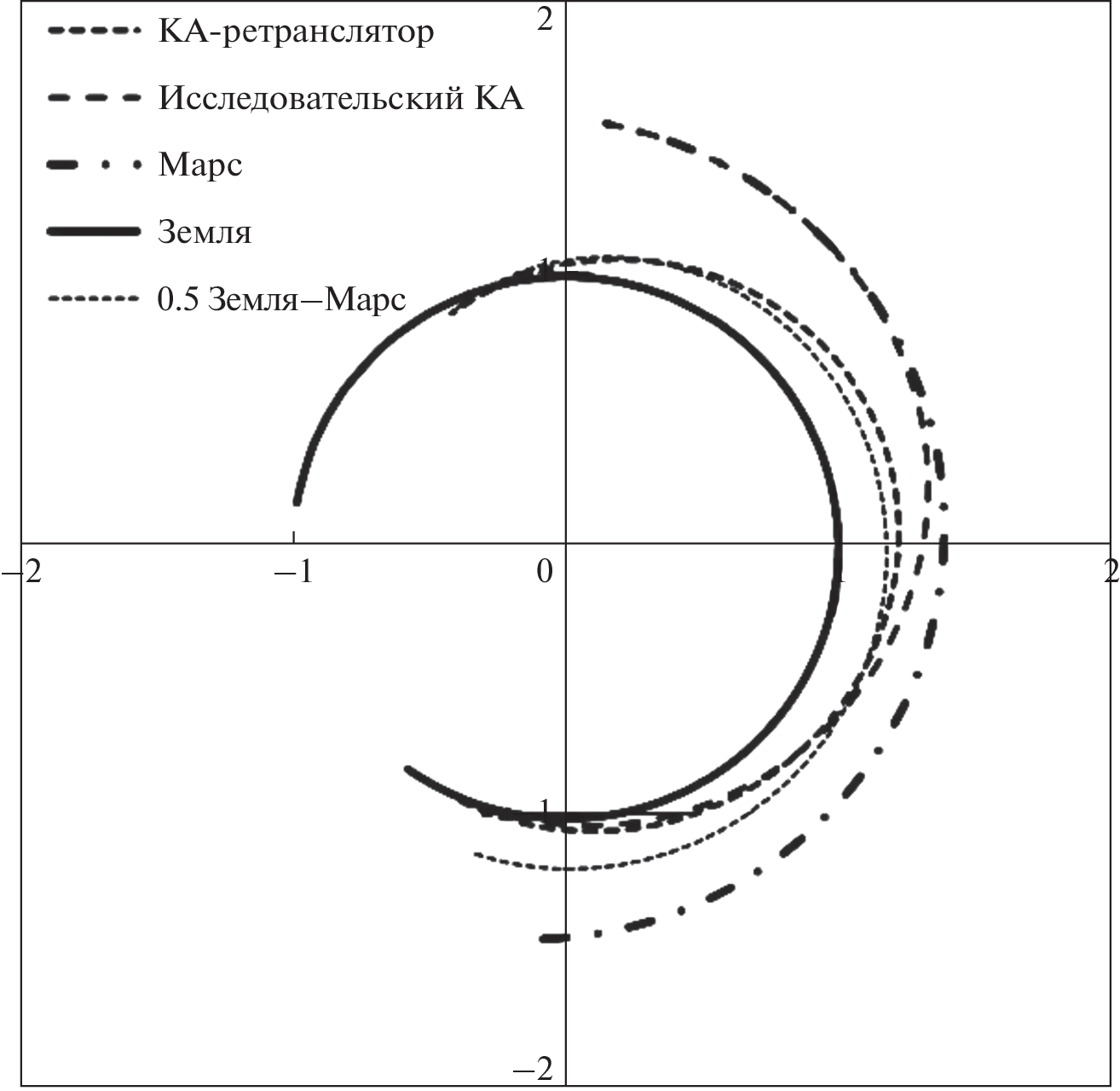 We have considered possible architecture options for an interplanetary communication system in which a data relay is used. The structure of a typical space communication link and the ways to improve its efficiency are analyzed. As one possibility, it is proposed to use accompanying orbital data-relay satellites providing the required data-transmission rate in the mode of formation flight together with the research spacecraft (SC). The optimization of the heliocentric leg of the flight trajectory of the Martian research SC and its accompanying data-relay satellite was carried out. The principal possibility of providing a formation flight of the data-relay satellite and research SC to improve communication with the Earth is demonstrated. Estimates were obtained for the masses of data-relay satellite and research SC with regard to the use of medium-lift launch vehicle of Soyuz type and a Fregat booster. Estimates are given for an increase in the duration of high-speed communication due to the use of a data-relay satellite in libration points L4 and L5 of the Earth–Sun system, as well as in heliocentric circular orbits with different radii.