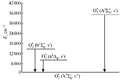 которые также регистрируются в инфракрасных спектрах свечения ночного неба как в атмосфере Земли [2, 3], так и Марса [10, 11]. На рис. 1 представлена схема трех систем полос, связанных со спонтанными излучательными переходами между различными электронными состояниями: полосы Герцберга I O2(A3Σu+,v') → O2(X3Σg–,v"), Атмосферные полосы O2(b1Σg+,v') → O2(X3Σg–,v"), Инфракрасные атмосферные полосы O2(a1Δg,v') → O2(X3Σg–,v"). Все приведенные состояния находятся ниже энергии диссоциации молекулы О2 ~41 300 см−1 (8065 см−1 = 1 эВ). Длины волн λ всех указанных на рисунке полос можно рассчитать по формулам