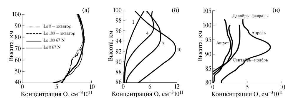 Также для верхней атмосферы Марса высотные распределения концентраций атомарного кислорода [O] используются согласно модели общей циркуляции (англ. General Circulation Model — GCM) французской лаборатории динамической метеорологии (франц. Laboratoire de Météorologie Dynamique — LMD), обычно называемой LMD-MGCM [21]. На рис. 2 представлены профили концентраций атомарного кислорода [О] для атмосферы Марса согласно [21] (рис. 2а) на северных широтах (67° N) и в экваториальной зоне (Ls ~0o, Ls ~180o), для верхней атмосферы Земли на средних широтах (55.7° N) согласно [2, 19] (рис. 2б) (для января, апреля, июля и октября 1980–1981 гг.) и для экваториальной области и северных тропиков (23° N) согласно [20] (рис. 2в) (зимний, весенний, летний и осенний сезоны). Полученные результаты показали значительный разброс значений абсолютных концентраций атомарного кислорода в атмосфере Земли на высотах максимальных значений, причем высота данного максимума также оставалась непостоянной. Этого мы не можем сказать о Марсе, так как разброс значений абсолютных концентраций атомарного кислорода малозаметен по сравнению со значениями для атмосферы Земли.