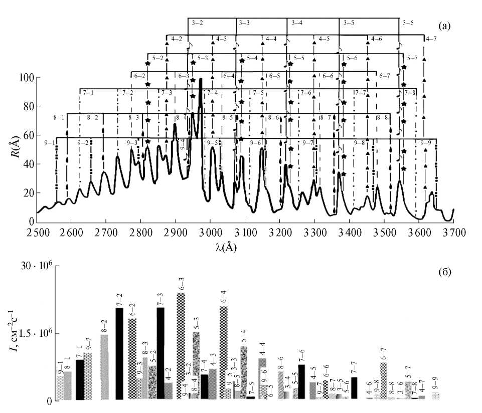 На рис. 4а и 5а представлен фрагмент усредненного спектра свечения ночного неба в диапазоне 250–370 нм, измеренного спектрографом с космического шаттла «Дискавери» (STS-53) в интервале от 115 до 900 нм на протяжении его 7-дневной миссии в декабре 1992 г. [3]. По осям Y отложены значения интенсивностей в рэлеях/ангстрем (R/Å) (1 Р = 106 фотон/см2с), по осям X отложены длины волн в ангстремах (λ(Å)). Каждая двойка цифр над пиками свечения обозначает колебательные уровни (v'–v") при излучательном переходе (1).
