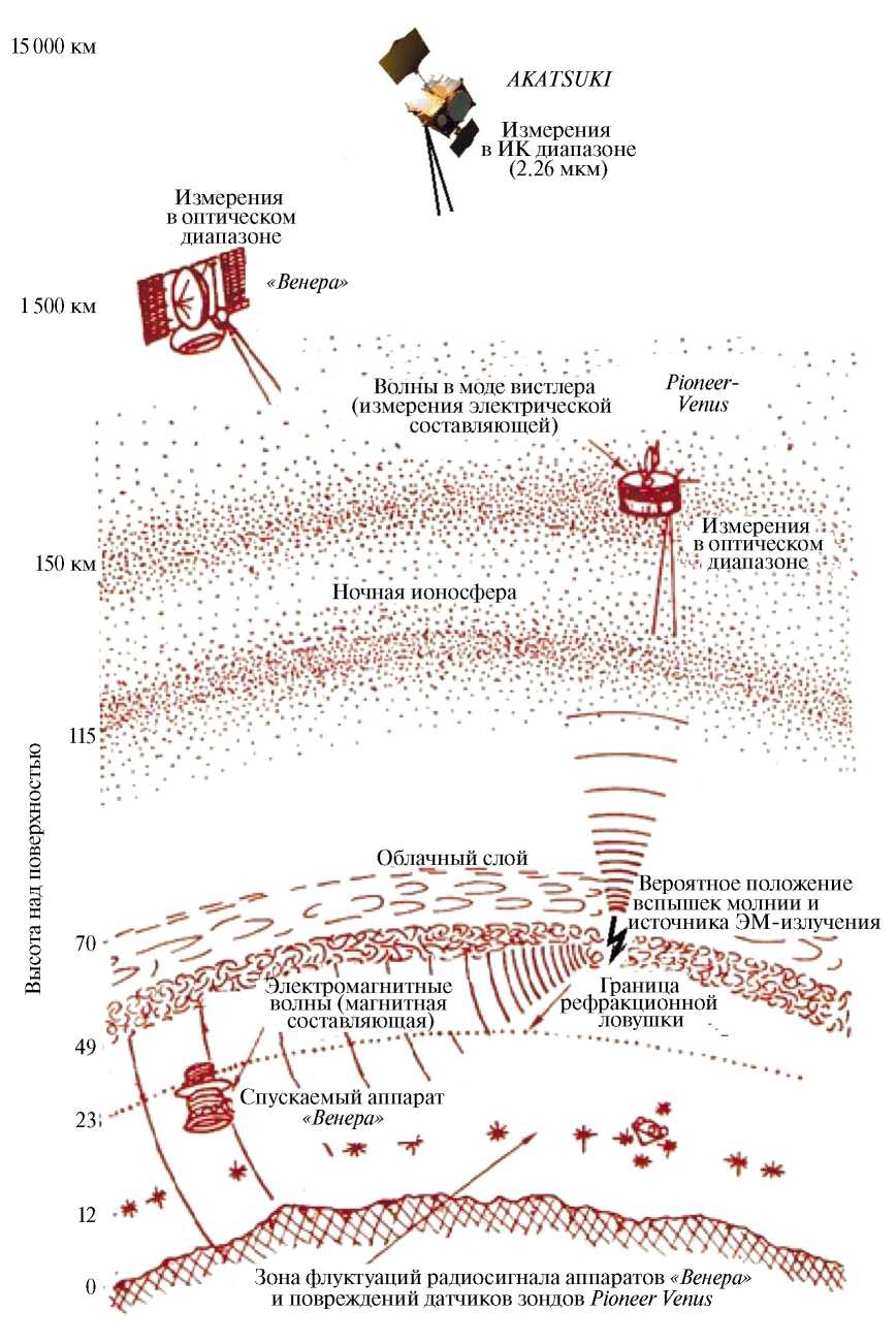 Рис. 1. Сравнительная схема работы аппаратов «Венера», Pioneer Venus и AKATSUKI при регистрации электромагнитного излучения молний и поиске их оптических вспышек.
