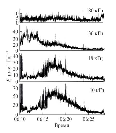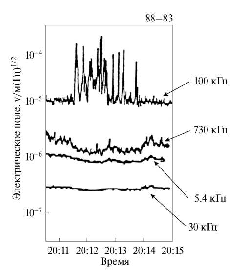 На рис. 2 приведен пример регистрации ЭМ-излучения приемником OEFD в начальной серии наблюдений [4, 3]. Авторы указывали на три свойства зарегистрированных импульсов, присущих волне в моде вистлера: сигнал наблюдается только в диапазоне 100 Гц, напряженность магнитного поля более 10 нТ, поле направлено к поверхности и пересекает ее. Несмотря на указанные ограничения, в эксперименте OEFD подобные результаты были получены в многочисленных прохождениях перицентра орбиты.