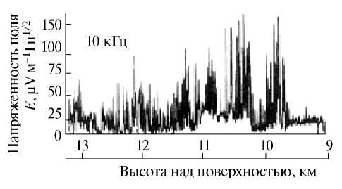 Приемник «Гроза» на аппаратах «Венера-11» – «Венера-14» был в преимущественном положении по сравнению с OEFD и регистрировал длинноволновое излучение источников, вероятно удаленных на тысячи километров (рис. 3). Благодаря высокой плотности атмосферы, длинноволновое излучение испытывает сильную рефракцию, образующую своеобразную ловушку, отклоняющую волну к поверхности [8]. Образуется необычный рефракционный «волновод». Наряду с монотонным характером изменения напряженности поля (до 80 мкВ м–1 Гц½) наблюдались его периодические изменения (рис. 4).
