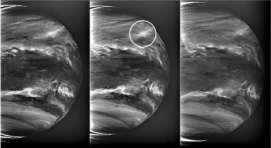 Три снимка от 13.VIII.2016. Как отмечалось выше, подавляющее большинство снимков камеры IR2 на длине волны 2.26 мкм имеют низкое разрешение. Снимков с высоким разрешением немного. Три ночных снимка безукоризненного качества, c высоким разрешением, r0023 (номер орбиты), 20160813 (дата в формате ГГГГММДД), 003333, 023333 и 043333 (время UTC в формате ЧЧММСС), были получены с интервалами 2 ч. Они приведены на рис. 5. Планетоцентрическая высота аппарата составляла 151.4 тыс. км. Координаты подспутниковой точки на среднем снимке 3.45° N/46.7° E (различия координат точки на снимках невелики). Контрастная система светлых и темных полос напоминает пояса и зоны Юпитера, но сходство, конечно, только внешнее. Наиболее четкий рисунок – средний, 023333. Светлая полоса, которая проходит примерно вдоль северной широты 20°, распадается на периодические волнообразные сгущения, разделенные интервалами по 9°. Выше на снимках, на широте около 36° и в 30° к востоку от центра среднего снимка (центр 3.45° N и 46.7° E) находится интересное метеорологическое образование (в белом кружке), назовем его L-объектом. Это яркая кольцевая структура диаметром около 600 км с исходящими радиально направленными лучами, отходящими на расстояние до 1000 км. В центре структуры видна яркая деталь.