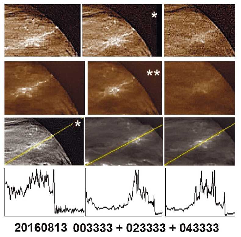 Рис. 10. Отдельные неповторяющиеся точечные детали, некоторые с лучами, обладают высокой яркостью, вплоть до уровня насыщения детектора. Предположительно, их можно отнести к глубоким разрывам облачной среды или к вспышкам супермолний. Яркость вдоль наклонных линий на фрагментах изображений показана диаграммами. Седловина на максимуме графиков обычно указывает на достигнутый уровень насыщения детектора. Снимок сделан камерой IR2 25.III.2016 г. в 07:33:33 UTC.