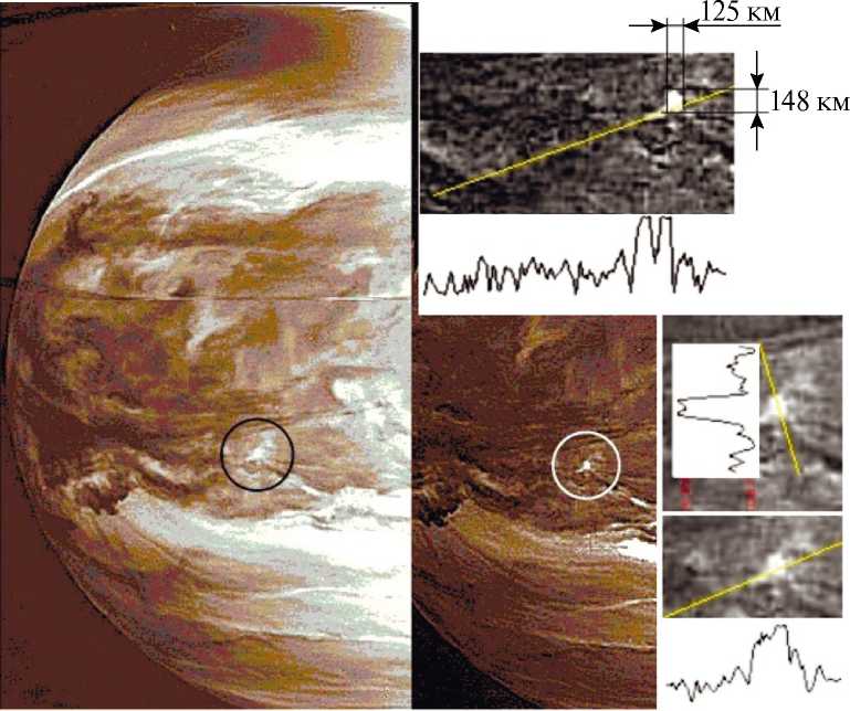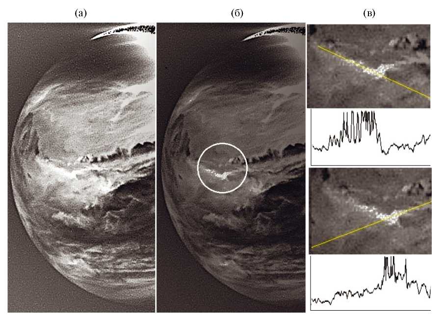 Яркое пятно на рис. 10, в черном кружке, имеет размеры 5–7 пикселов (120–150 км). Средняя длина земной молнии – несколько километров, но максимальная зарегистрированная – более 300 км [17, 18]. Пятно на рис. 10 обладает высокой яркостью, вплоть до насыщения детектора, что показано наклонными сечениями на рисунке. Учитывая, что столь высокая яркость наблюдалась у пятна площадью 1.5 · 104 км2, предположительно, можно отнести это пятно к рассеянному излучению от вспышки супермолнии. Яркость вдоль наклонных линий на фрагментах изображений показана диаграммами, указывающими на насыщение детектора. Но возможно и другое происхождение пятна – локальный разрыв в облаках протяженностью до 150 км. Тогда высокая яркость является следствием высокой температуры излучающей среды. Авторы работы [14] рассматривали возникающие нисходящие потоки, создающие «прозрачные окна». Возможно, такие локальные «окна» могли бы возникнуть в нисходящих потоках.