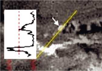 Рис. 6. Верхний ряд – L-объект на трех последовательных снимках, второй ряд – те же снимки со смещенным вверх уровнем черного, ряды 3 и 4 – распределение яркости вдоль линий сечения изображений второго ряда.