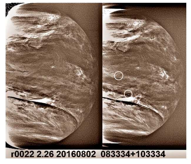Рис. 11. Яркие точечные объекты имеют размеры около 30–50 км. Пара изображений позволяет сопоставить два снимка, полученных камерой IR2 2.VIII.2016 в 08:33:34 и 10:33:34 UTC, с яркими, до уровня насыщения детектора, мелкими деталями, отсутствующими на левом снимке.