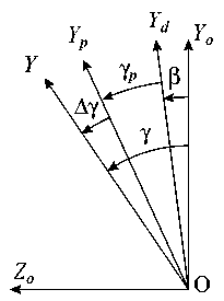 Приборная система координат (ПСК) вводится следующим образом. Обозначим малые ошибки ориентации гирокомпаса относительно ОСК: — курс (Yd); — тангаж ; — крен , при этом матрицу ориентации, составленную из этих компонент , всегда будем считать ортогональной с точностью до величин второго порядка малости, для которой выполняется условие