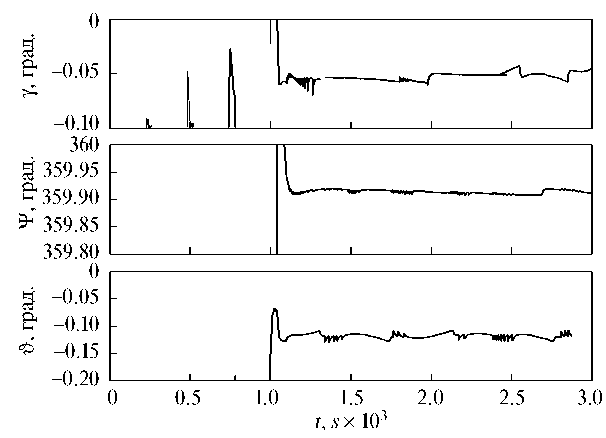 На рис. 3 представлены графики переходных процессов ориентации КА по программе калибровочного режима. Для большей наглядности были приняты следующие завышенные погрешности приборов: