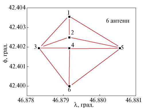 На рис. 1 представлен эскиз картографической привязки шести антенн экспериментальной антенной решетки на участке в окрестности г. Маяк. Данная конфигурация инструмента близка к конфигурации интерферометра с минимальной избыточностью для ограниченного числа антенн.