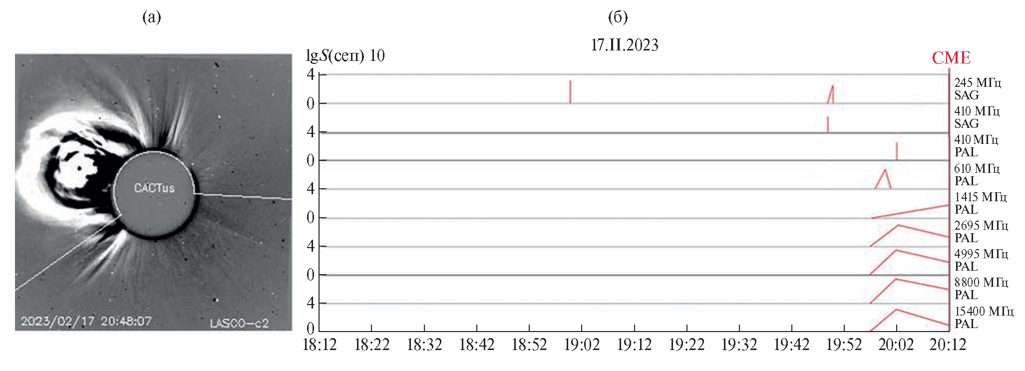 Рис. 1. Пример КВМ, зарегистрированного CACTus (LASCO/C2) 17.II.2023 в 20:12UT (а), и его радиопредвестников (б).