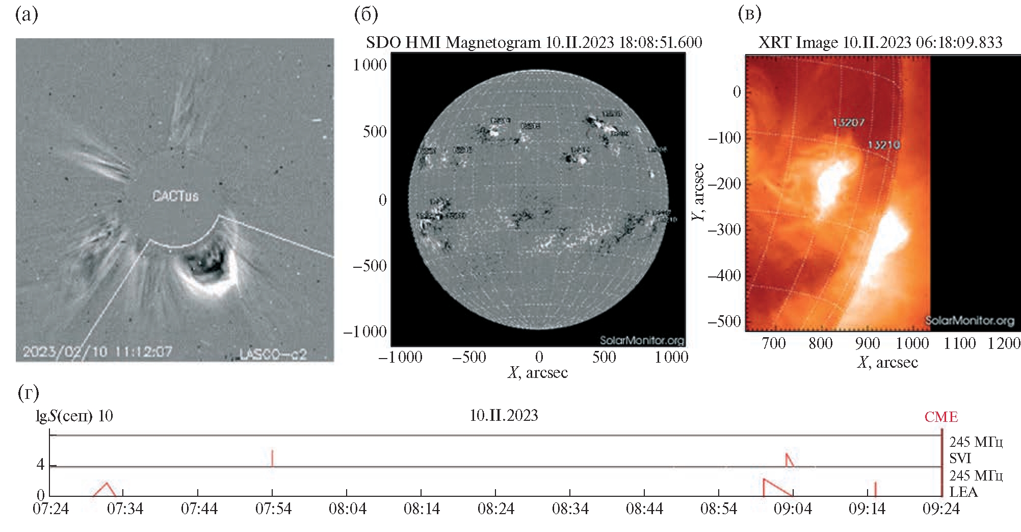 На рис. 6а показан КВМ, зарегистрированный 10.II.2023 в 09:24 UT. Радиоизлучение в виде импульсных всплесков на f = 245 МГц (рис. 6г) отмечено в интервале 2 ч до регистрации КВМ. Скорее всего, КВМ выходит из области, расположенной на самом краю солнечного диска, что подтверждается картой распределения магнитных полей (рис. 6б) и изображением данной области Солнца в рентгеновских лучах (рис. 6в) (solarmonitor.org).