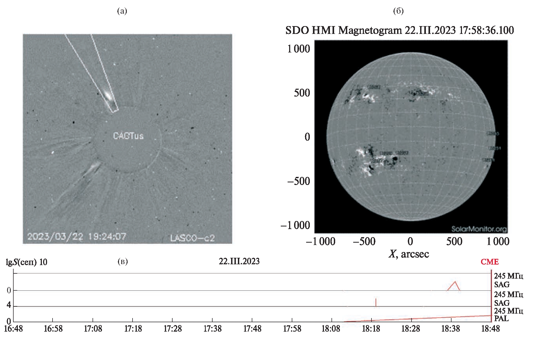 Событию КВМ 22.III.2023 в 18:48 UT (рис. 7а) предшествовало спорадическое радиоизлучение в диапазоне до 180 МГц и радиопредвестники в низкочастотной части спектра (245 МГц) за 2 ч до регистрации события (рис. 7в) (ftp://ftp.swpc.noaa.gov/pub/warehouse). Расположение АО на карте магнитных полей на Солнце (рис. 7б) и наличие радиопредвестников можно расценивать как свидетельство существования источника КВМ в области, находящейся в соответствии с развиваемыми представлениями на невидимой части диска Солнца.