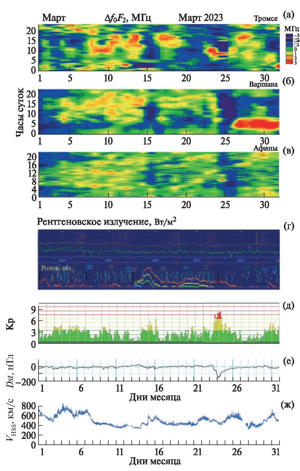 Рис. 3. Поведение индекса ΔfоF2 для 3 ионосферных станций: Афины (в), Варшава (б), Тромсё (а); временной ход рентгеновского излучения и потока протонов (г); индексы Кр (д) и Dst (е); график скорости высокоскоростных потоков солнечного ветра (VHSS, км/с) за март 2023 г. Горизонтальная ось – дни месяца; левая вертикальная ось: для ΔfоF2 – время суток (ч, UT), для всех остальных – значения величин.