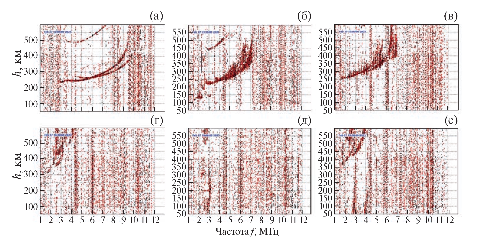 Рис. 5. Ионограммы вертикального зондирования, полученные на ионосферной станции п. Васильсурск 27.II.2023: 12:00 (а), 13:30 (б), 15:00 (в), 16:30 (г), 18:00 (д), 19:30 UT (е).