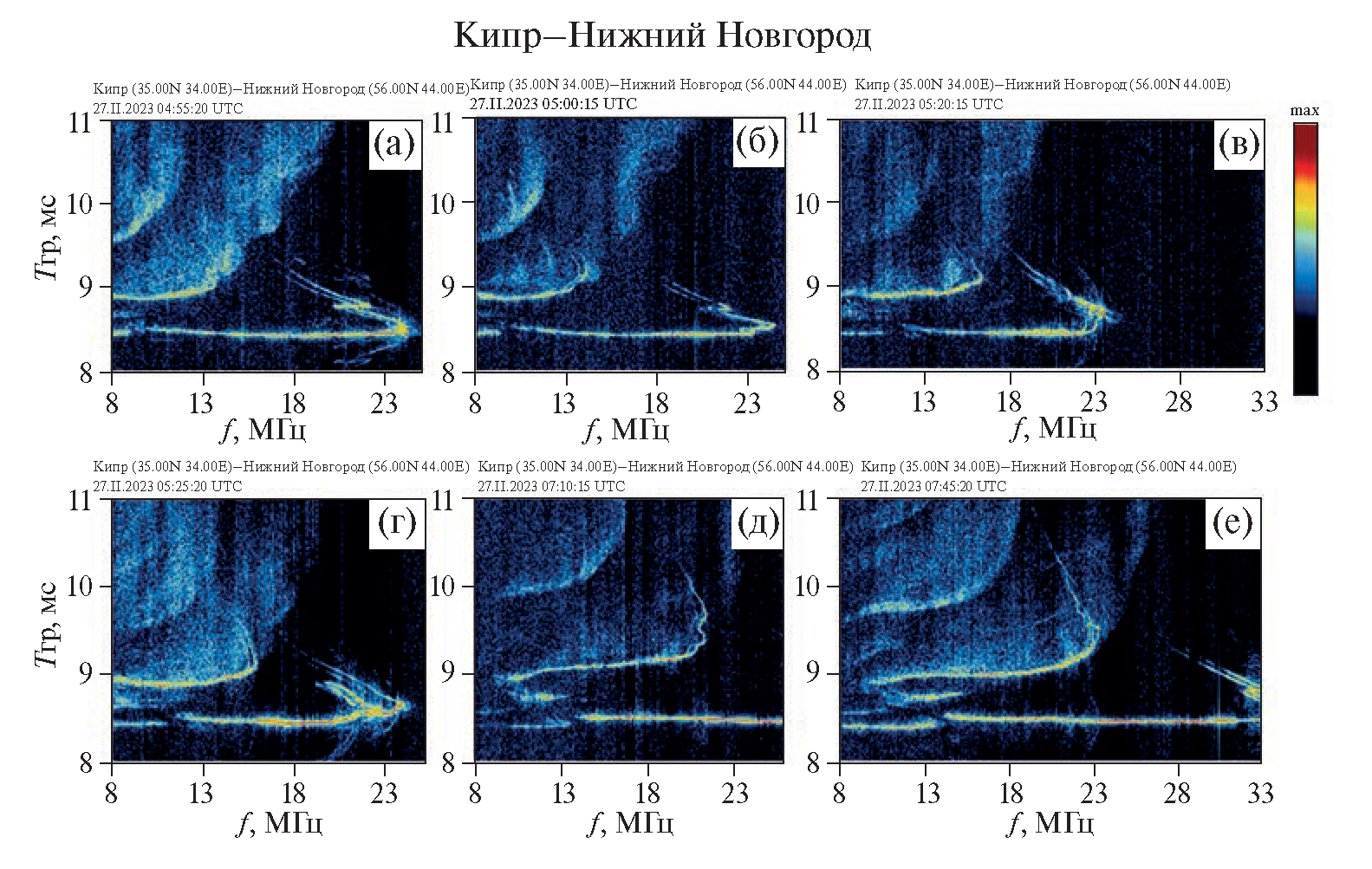 Рис. 6. Дистанционно-частотная характеристика ЛЧМ-сигнала на трассе зондирования Кипр – г. Нижний Новгород 27.II.2023: 04:55 (а), 05:00 (б), 05:20 (в), 12:00 (г), 05:25 (д), 07:10 (е).