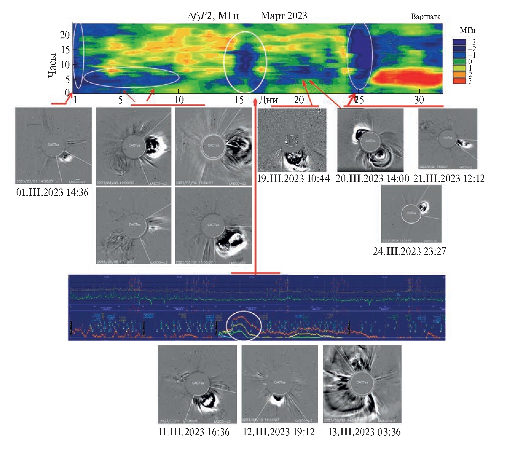 Рис. 7. Иллюстрация совместного анализа поведения индекса ΔfоF2 по данным ионосферной станции Варшава и регистрации КВМ в марте 2023 г.