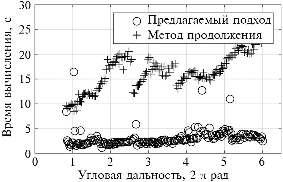 На рис. 3 представлено время вычисления решений с разной угловой дальностью двумя рассмотренными методами. Среднее время поиска решения составляет 16 с для метода продолжения и 3 с для метода внутренней точки.