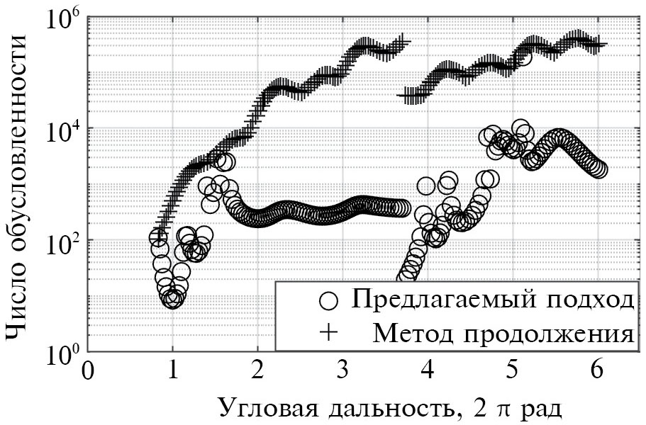 Оно равно соотношению между максимальным и минимальным сингулярными значениями матрицы A. На рис. 4 показаны числа обусловленности для семейства оптимальных траекторий перелета с различной угловой дальностью, полученных двумя подходами. Среднее значение чисел обусловленности для решений, найденных методом продолжения в декартовых координатах, равно 1.3·105, в то время как для решений, полученных методом внутренней точки в KS-переменных, число обусловленности в среднем составляет 4.3·103, что означает лучшую обусловленность матрицы чувствительности.