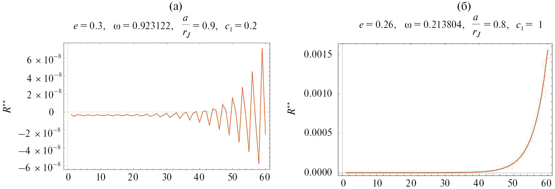 Из рис. 2 видно, что функция R∗∗ выходит на свое значение в фиксированной точке, начиная с частичной суммы, содержащей 12 членов ряда (коричневая кривая), в то время как результат численного интегрирования представлен в виде колебаний вплоть до n = 20 (синяя кривая), с последующим выходом кривой на значение функции в той же точке. Показано, что при n ≥ 20 результаты расчетов по формуле (11) совпадают с результатами численного интегрирования R(int) на сетке значений e ∈ [0, 0.9] с шагом 0.1, (a / rJ) ∈ [0.5, 0.95] с шагом 0.05, ω ∈ [0, π] с шагом π / 6, i ∈ [−π / 2, π / 2] с шагом π / 6.