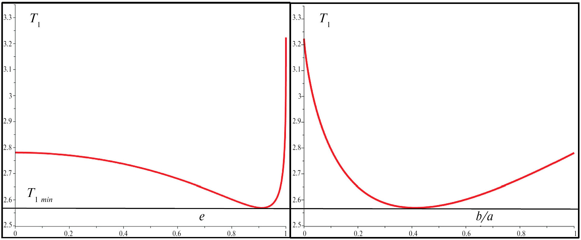 Графики зависимостей T1 от эксцентриситета e и от отношения полуосей приведены на рис. 5. Минимальное значение T1 достигается при e = 0.9085 (b / a = 0.4189), причем T1min = 2.5691.
