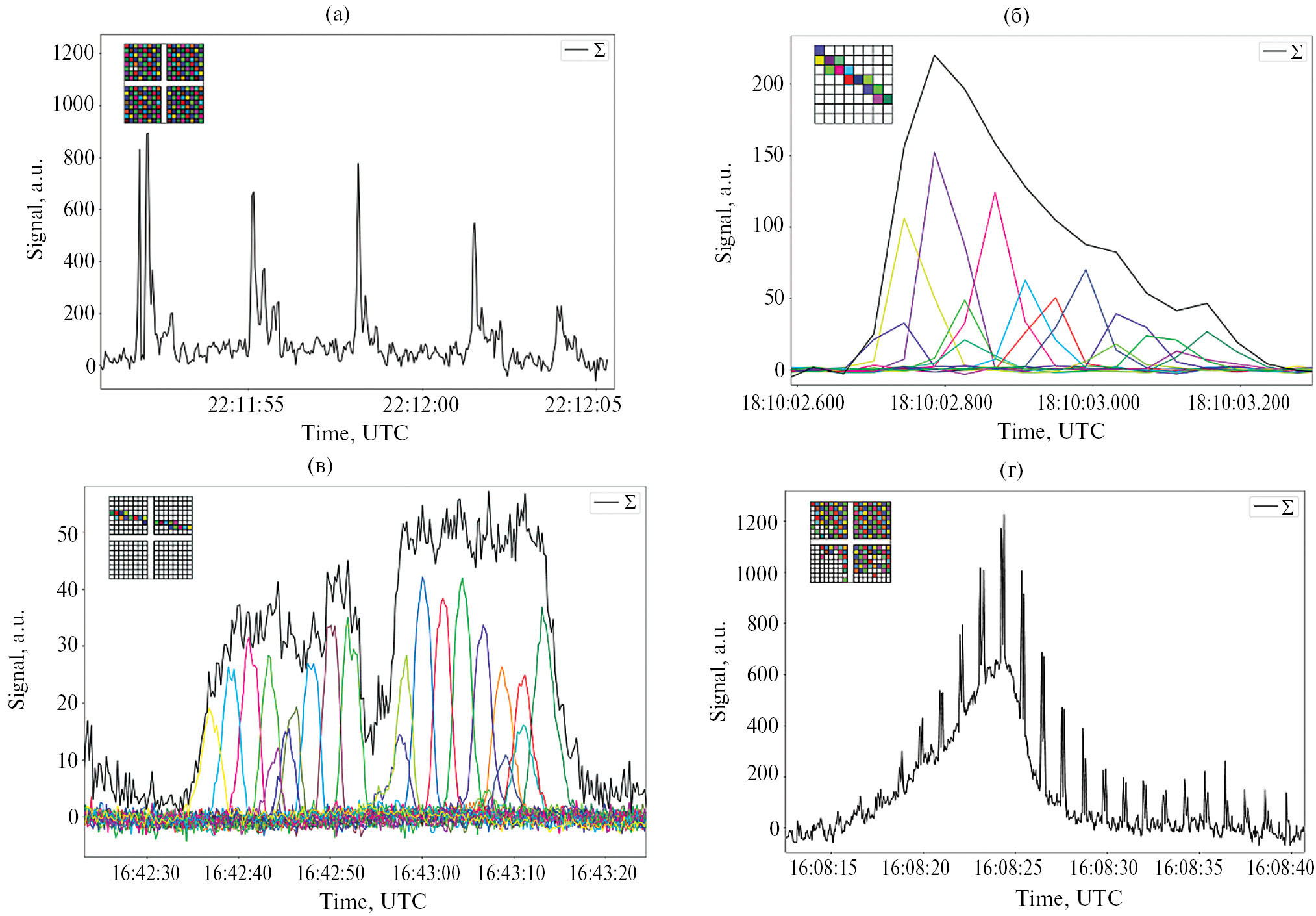 Этот алгоритм был применен ко всей базе данных, проанализирована эффективность его работы. Оказалось, что результат сильно зависит от настроечных параметров. При малых величинах порога отбираются шумовые импульсы, а при больших – пропускается много полезных событий. Поэтому, такой предварительный отбор был использован для определения интервалов с большим количеством микровсплесков, которые затем отсматривались и анализировались отдельно (в частности, серии 27–29.XI.2021, которые будут подробно описаны ниже). Также из базы данных были исключены события, связанные с пролетами метеоров, спутников и самолетов. Эти события обнаруживались визуально по характерным пространственно-временным паттернам. При регистрации метеора наблюдается короткий колоколообразный пик с характерной пространственной структурой на матрице фотоприемника в виде узкого трека. Спутник пролетает через все поле зрения, оставляя трек с квази-постоянной интенсивностью свечения. Попадание самолета в поле зрения характеризуется наличием эквидистантных коротких пиков на кривой свечения, связанных с миганием бортовых огней. Примеры событий показаны на рис. 1б–г. Другие примеры с подробным анализом можно найти в работе [21]. На рис. 1а показан пример УФ-микровсплесков, которые существенно отличаются как по временной, так и пространственной структуре сигнала: видна последовательность импульсов разнообразной формы, а на карте каналов сигнал распределен по всему полю зрения.