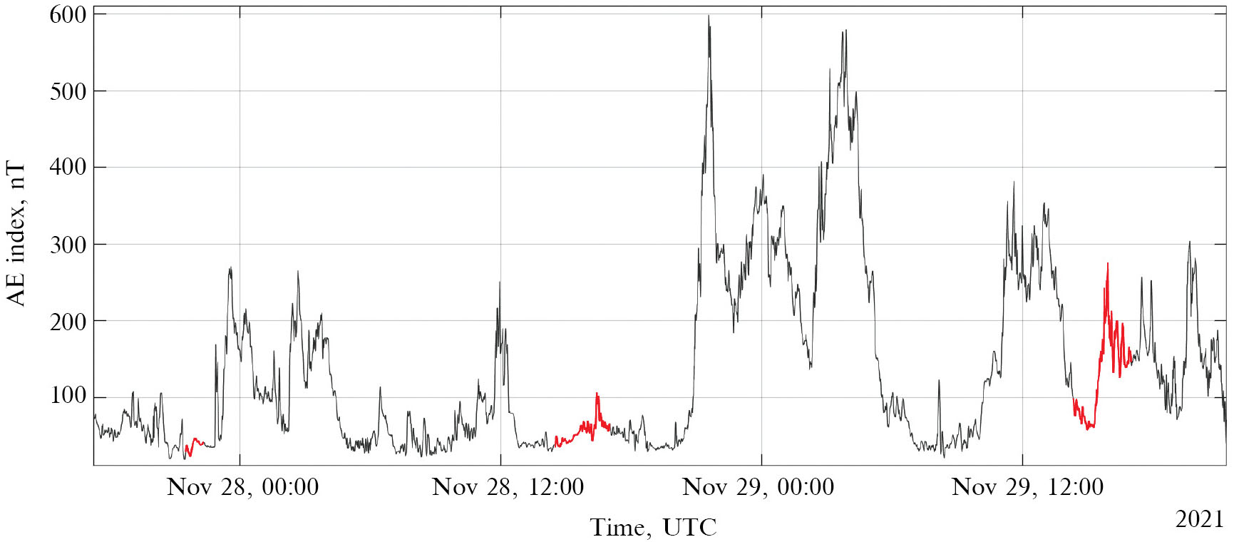 Рис. 2. АЕ-индекс геомагнитной активности в период 27–30.XI.2021. Красным цветом показаны временные интервалы регистрации последовательности УФ-микровсплесков.