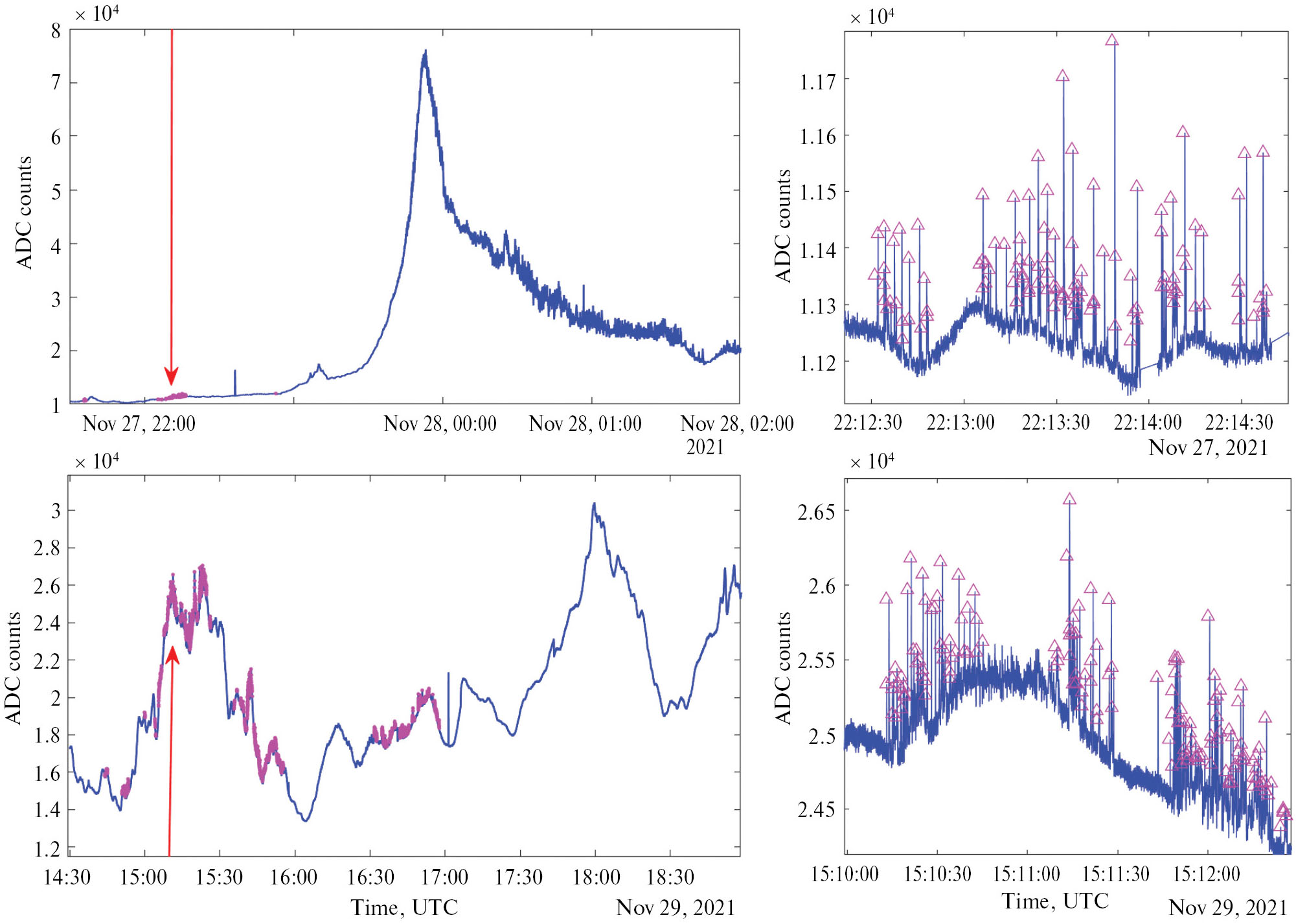Рис. 3. Сверху: результаты наблюдения микровсплесков 27.XI.2021. Слева показана кривая свечения от момента заката до 02:00 UTC. Справа – временной интервал, содержащий микровсплески. Розовыми маркерами отмечены отобранные микровсплески. Положение интервала на кривой свечения обозначено красной стрелкой. Снизу: тоже самое для 29.XI.2021 г.