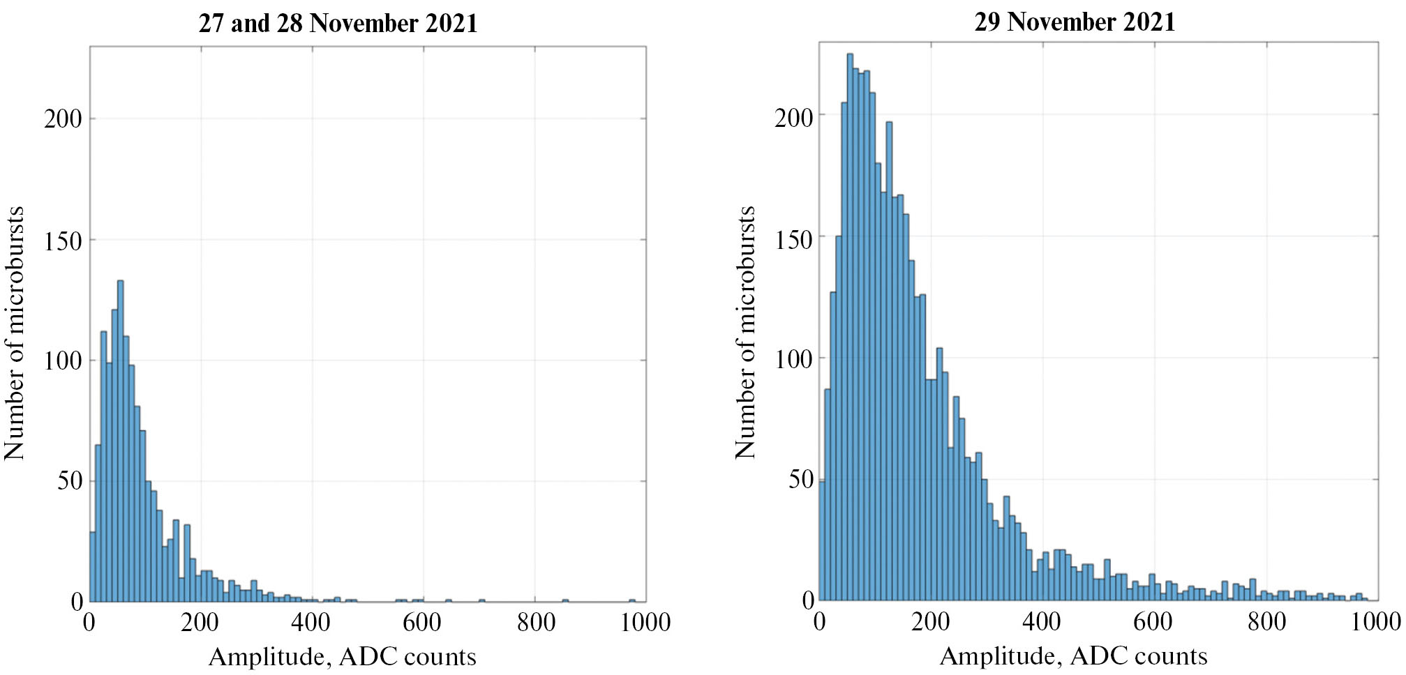 Отдельно для случаев с низкой геомагнитной активности (27 и 28.XI.2021) и во время суббури (29.XI.2021) были проанализированы некоторые характеристики последовательностей УФ-микровсплесков. На рис. 4 показаны распределения микровсплесков по амплитуде (слева для 27 и 28, справа для 29 ноября). Видно, что для дней в условиях низкой геомагнитной активности распределение уже и смещено в сторону малых амплитуд. Медианные значения совпадают, но доля всплесков с большой амплитудой преобладает 29.XI.2021, когда микровсплески наблюдались на фоне полярных сияний. Если интерпретировать УФ-микровсплески как проявления высыпания электронов высокой энергии, то в этом случае можно говорить об увеличении энерговыделения в атмосфере, которое связано с ростом числа частиц в пучке или их энергией. Максимальную энергию частиц можно определить по глубине свечения методом триангуляции или спектральным анализом свечения.