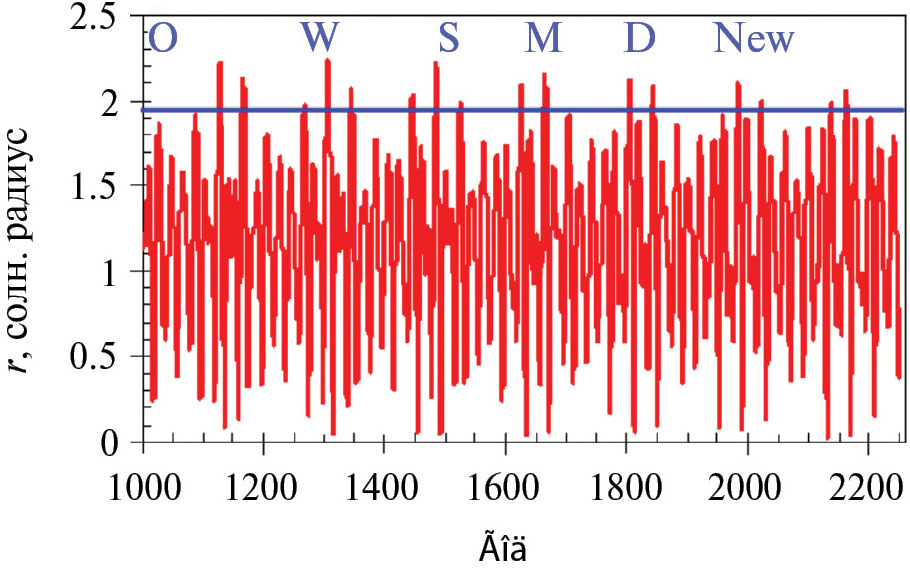 Рис. 2. Расстояние от центра масс Солнечной системы до центра Солнца в зависимости от времени (расчет [4]). Горизонтальная линия наверху проведена для значения солнечного радиуса r = 2. Буквы наверху обозначают глубокие минимумы солнечной активности, наблюдавшиеся в прошлом (см. подпись к рис. 1). New – современный глубокий минимум солнечной активности [1].