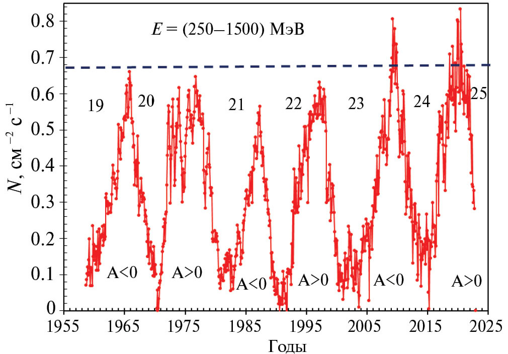 Рис. 3. Временной ход среднемесячных значений потоков вторичных заряженных частиц, образованных космическими лучами в атмосфере. Энергии космических частиц находились в интервале 200…1500 МэВ. Наверху указаны номера 11-летних солнечных циклов. A > 0 и A < 0 обозначают положительную и отрицательную фазы 22-летних солнечных магнитных циклов. Горизонтальная пунктирная линия показывает максимальный поток космических лучей, который был зарегистрирован ранее в минимуме солнечной активности 20-го солнечного цикла в 1965 г.