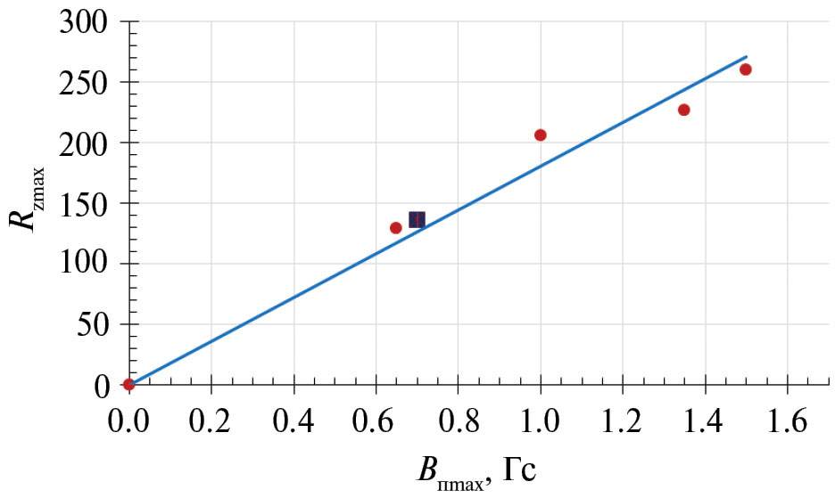 На рис. 4 представлена зависимость Rzмах от Bпmax. Максимальные значения числа солнечных пятен в 11-летних СЦ были взяты с сайта Центра анализа данных о влиянии Солнца (https://www.sidc.be/silso/datafiles), а максимальные значения индукции солнечного полярного магнитного поля Bпmах – с сайта службы (http://wso.stanford.edu/gifs/Polar.gif). Полоидальное полярное магнитное поле Солнца преобразуется в тороидальное дифференциальным вращением солнечного вещества [5]. Солнечные пятна возникают из тороидального магнитного поля [5].