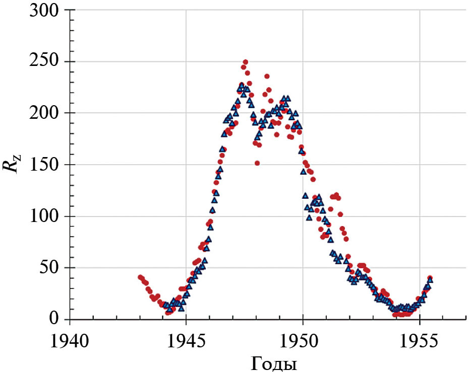 Рис. 5. Временные зависимости среднемесячных значений чисел солнечных пятен Rz(t) в 22-м (точки) и 18-м (треугольники) СЦ. Величины Rz были сглажены по пятимесячным данным. Оба ряда данных были совмещены по времени: май 1986 г. (22-й СЦ) был совмещен с февралем 1944 г. (18-й СЦ).