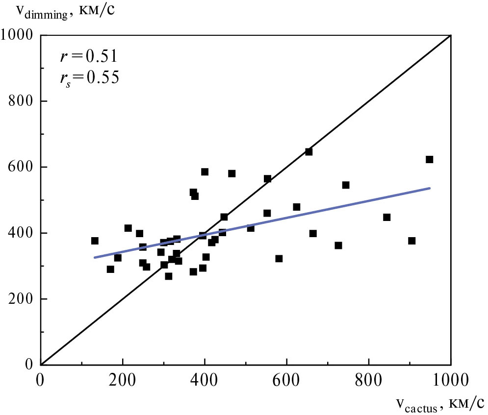 По этой формуле в настоящей работе были рассчитаны скорости соответствующих КВМ из выборки. Для данных событий средняя скорость, рассчитанная в CACTus, составила 433 км/с; средняя скорость, рассчитанная по параметрам диммингов, составила 403 км/с. В рамках модельного представления мы получили, что для низкоскоростных КВМ скорости по диммингам получаются завышенными относительно скоростей, полученных по наблюдениям с коронографа; для высокоскоростных – заниженными, что отображено на рис. 1. Вероятно, это связано с различным количеством КВМ с разными скоростями в не очень большой выборке.