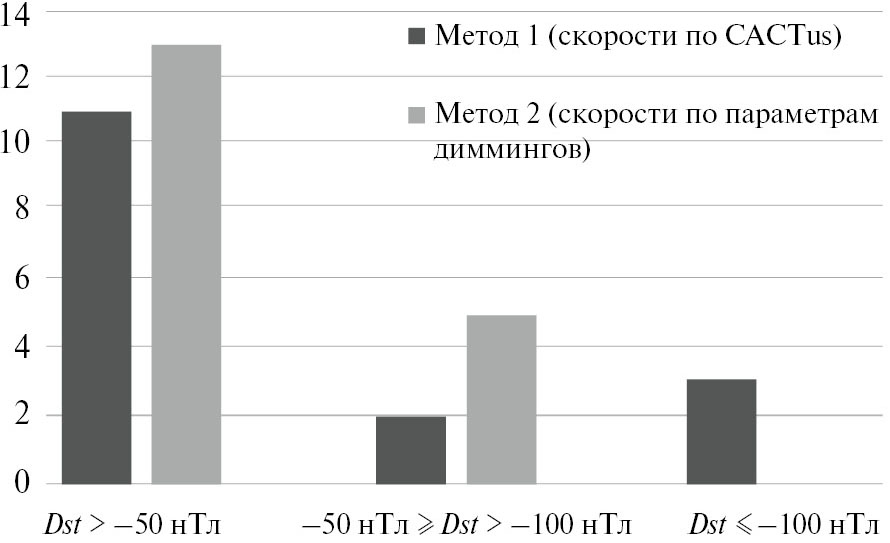 Среди 11 событий, предсказанных двумя методами, встречаются события, вызвавшие как умеренные геомагнитные возмущения, так и слабые (использован минимальный Dst из базы данных OMNI, https://omniweb.gsfc.nasa.gov/). Для слабых геомагнитных возмущений (Dst > –50 нТл) по двум методам удачно (hit) спрогнозировано девять событий, для умеренных (–50 нТл > Dst > –100 нТл) таких событий два. Причем среди слабых геомагнитных возмущений выше доля событий, которые были лучше спрогнозированы по методу 2 (67%), в то время как все МКВМ, вызвавшие умеренные геомагнитные возмущения, были точнее предсказаны по методу 1 с использованием скоростей КВМ. Среди событий, предсказанных двумя методами по отдельности (16 и 18 для 1-го и 2-го метода соответственно), встречаются также и события, вызвавшие сильные геомагнитные возмущения (Dst < –100 нТл). Распределение событий по силе геомагнитного возмущения для двух методов представлено на рис. 3. Опять же, для слабых возмущений больше событий лучше спрогнозированных по методу 2, а все сильные события были предсказаны лучше по методу 1. Вероятная причина этого – заниженная оценка скорости по параметрам димминга более быстрых геоэффективных КВМ, которые с большей вероятностью приведут к более сильной магнитной буре.