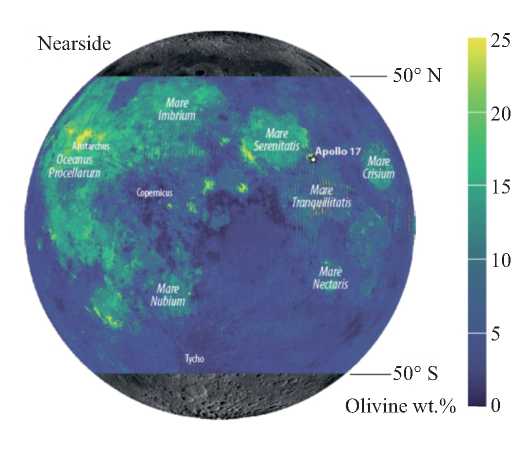 На поверхности Луны оливин широко распространен в морских районах с преобладанием базальта по сравнению с анортозитовыми континентами (рис. 1). В породах лунных морей состав оливина отражает геохимическую обстановку в мантии и тектонические процессы [2]. Так, оливин в пирокластическом отложении «оранжевого стекла», доставленного Аполлон-17, сохраняет примитивные расплавленные включения, содержащие >1000 ppm H2O. Таким образом, некоторые части лунных недр могут содержать столько же воды, сколько базальты срединно-океанических хребтов Земли (так называемые MORB-базальты) [3]. «Влажная» Луна, что подразумевают такие находки, несовместима с полной потерей летучих соединений после мега-удара и предполагает либо менее энергичный сценарий ее образования, либо более позднее добавление летучих соединений метеоритами и кометами. Изотопный состав воды, адсорбированной на поверхности или включенной в кристаллическую структуру вышеупомянутых мантийных минералов, мог бы помочь разрешить этот важный вопрос.