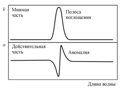 Основными входными данными в модели взаимодействия излучения с веществом являются n и k, реальные и мнимые компоненты комплексного показателя преломления, n* = n + ik. При поглощении, действительная часть n комплексного показателя преломления n* демонстрирует аномалию, как схематично показано на рис. 2. Этот эффект особенно очевиден в среднем инфракрасном диапазоне, поскольку узкие полосы поглощения вызывают сильную аномалию n. Как следствие, спектры ИК-отражения сильно отличаются от соответствующих спектров пропускания и соотношения Крамерса – Кронига могут быть использованы для анализа их корреляции с данными о поглощении электромагнитных волн веществом.