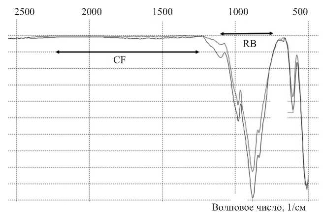 Рис. 3. Эмиссионные особенности в ИК-спектре пропускания оливина: CF— особенность Кристиансена; RB — полоса остаточного излучения. Черная линия — оливин из авачитов (Fo90), красная линия — оливин из кимберлитовой трубки «Мир» (Fo95).