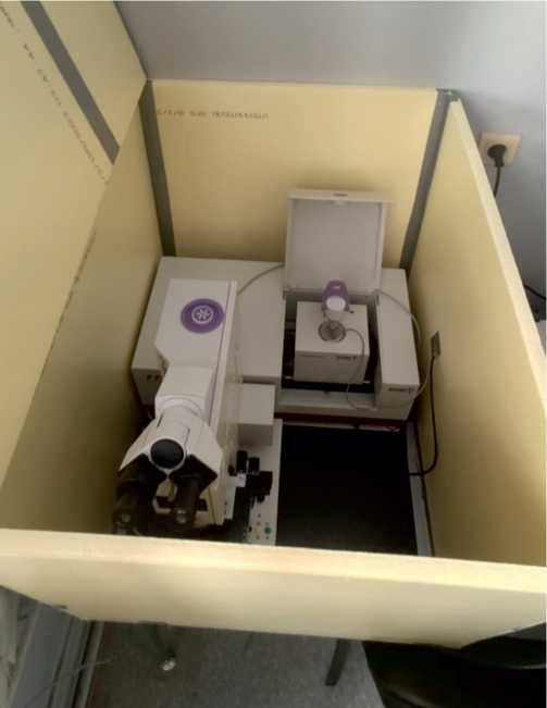 Для уменьшения воздействия атмосферной влаги и газов, которые могут искажать ИК-спектры минералов (в основном, CO2 и O2), мы доработали стандартный вариант установки ИК-Фурье спектрометра. Прибор был помещен в газонепроницаемый футляр (рис. 4), куда вводился инертный газ, аргон, из баллона (не показан на рисунке). Поскольку плотность аргона (~1.78 г/см3) больше плотности воздуха (~1.22 г/см3), при заполнении футляра он вытеснял воздух из зоны анализа, что проверялось регулярным снятием фонового сигнала без образца.