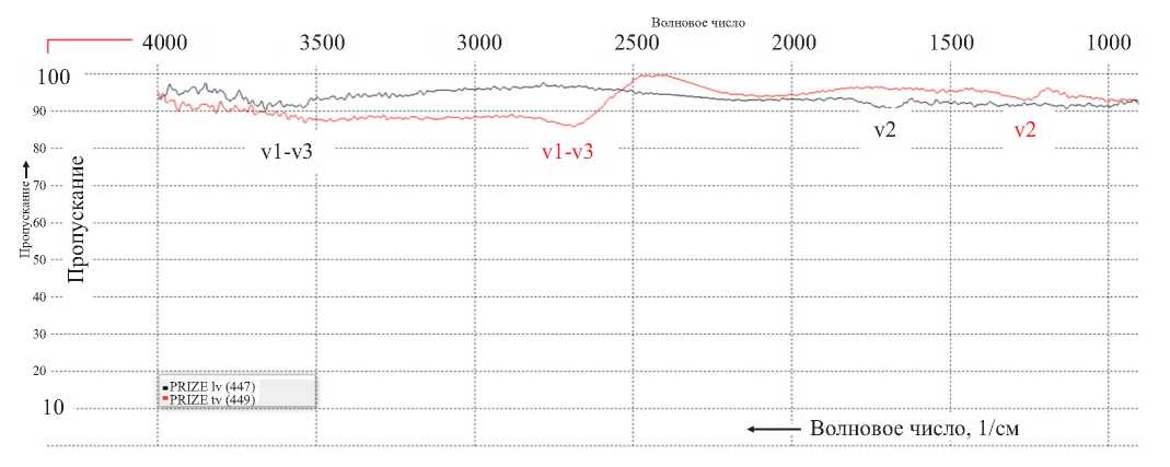 Рис. 5. ИК-спектр пропускания (ПРИЗ) расплавленного льда: черная линия — «легкая» вода; красная линия — «тяжелая» вода (жидкость+пар).