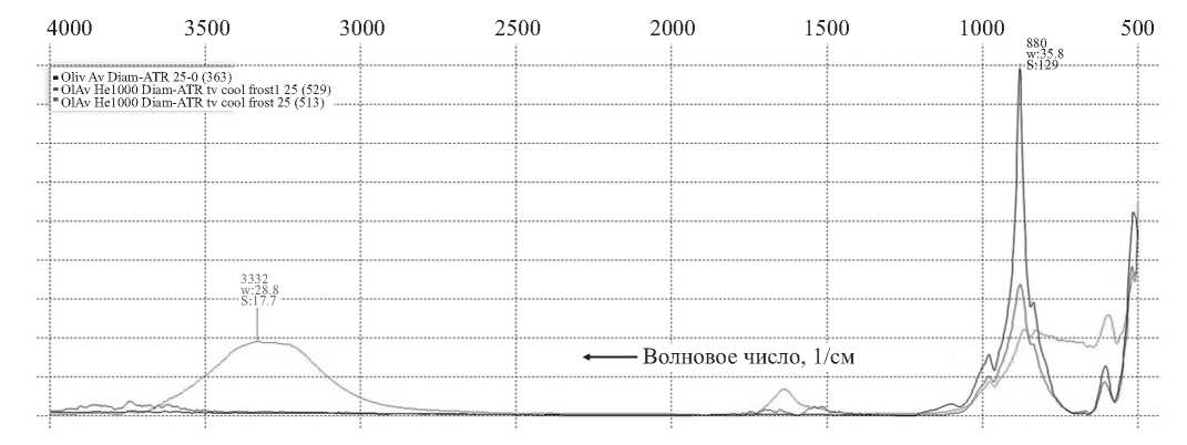 Рис. 6. ИК-спектр поглощения (НПВО) оливин+иней: черная линия — сухой минерал, зеленая линия — с «легким» льдом, красная линия — с «тяжелым» льдом.