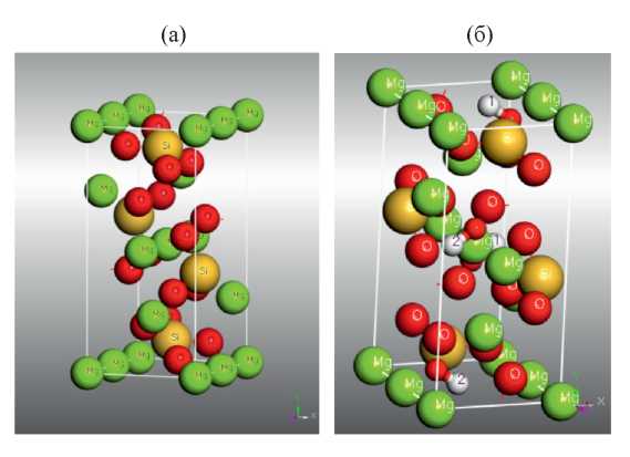 Рис. 7. Кристаллическая ячейка форстерита: (а) — начальная конфигурация; (б) — конфигурация с включенными группами -OH (1) и -OD (2).