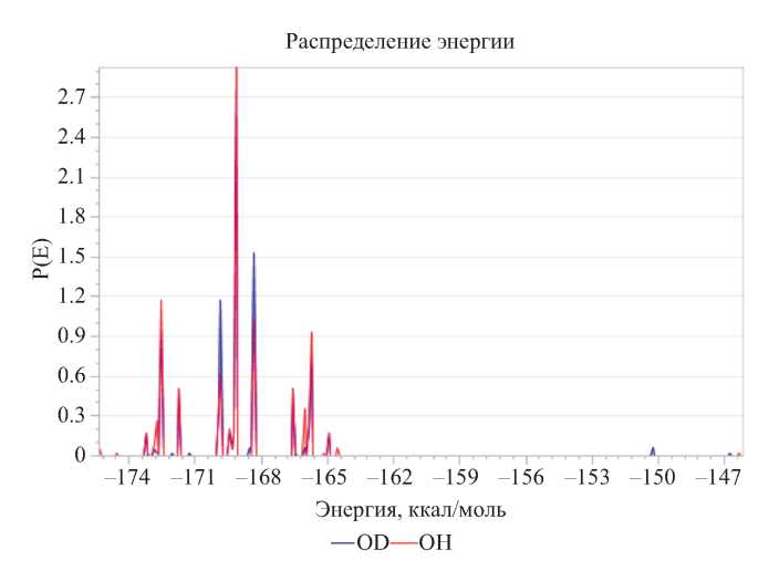 Рис. 8. Распределение энергии абсорбированных форстеритом гидроксильных групп -OH и -OD.