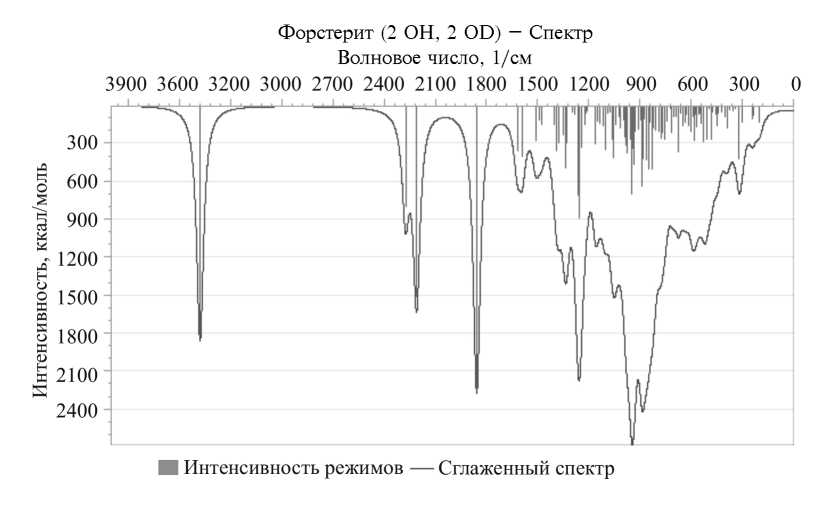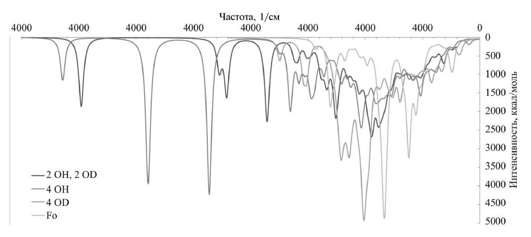 Помимо равной, термодинамически обусловленной, абсорбции изотопологов воды кристаллической ячейкой форстерита, возможны ситуации, когда поглощается преимущественно только та или иная изотопная форма гидроксила. Поэтому также необходимо рассчитать спектральные характеристики кристаллических ячеек, включающих либо только четыре гидроксильные группы -OH, либо только четыре группы -OD. Результаты расчетов ИК-спектров и оптических свойств для абсорбированных таким образом -OH или -OD гидроксилов представлены на рис. 11.