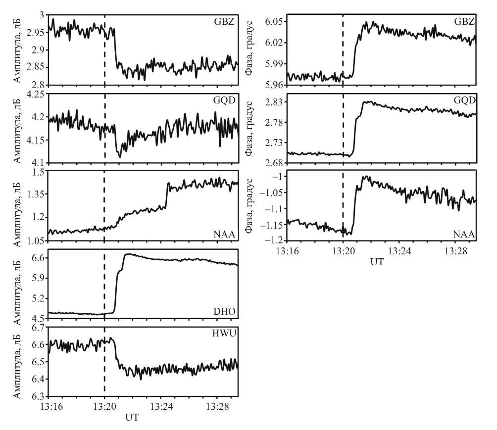 Более детально возмущение амплитуды и фазы на отдельных радиотрассах JJY и NWC показаны на рис. 3. Скачок фазы здесь достигает ~10…30°.