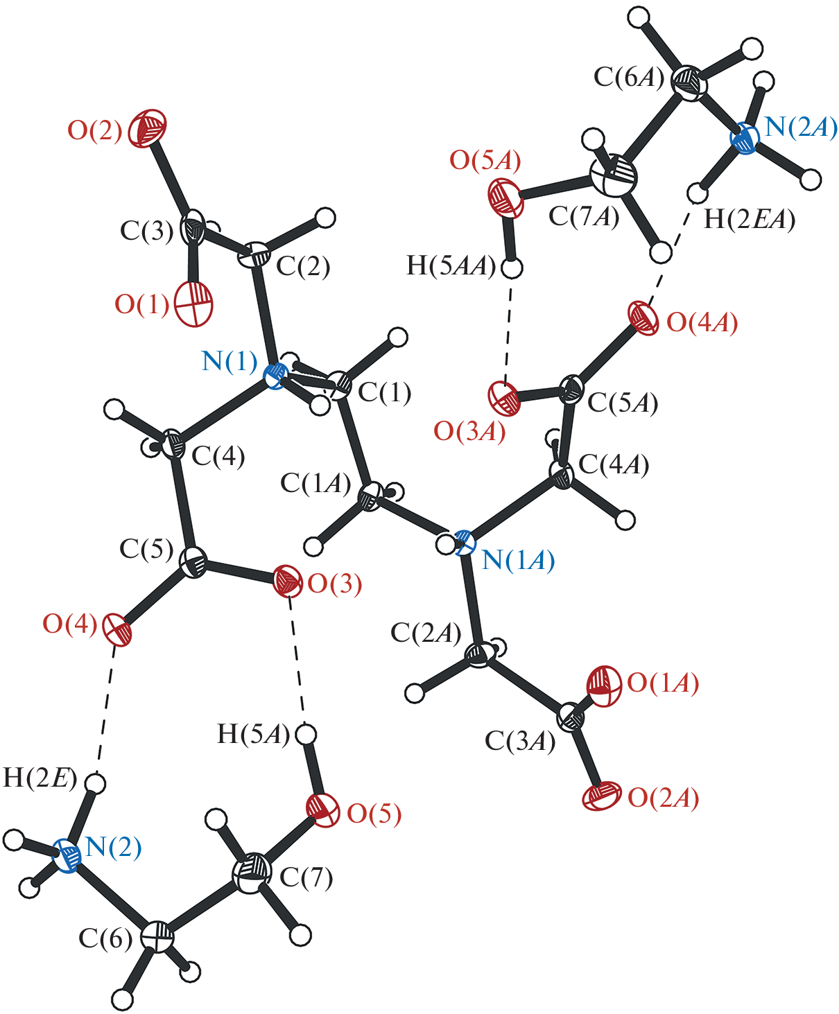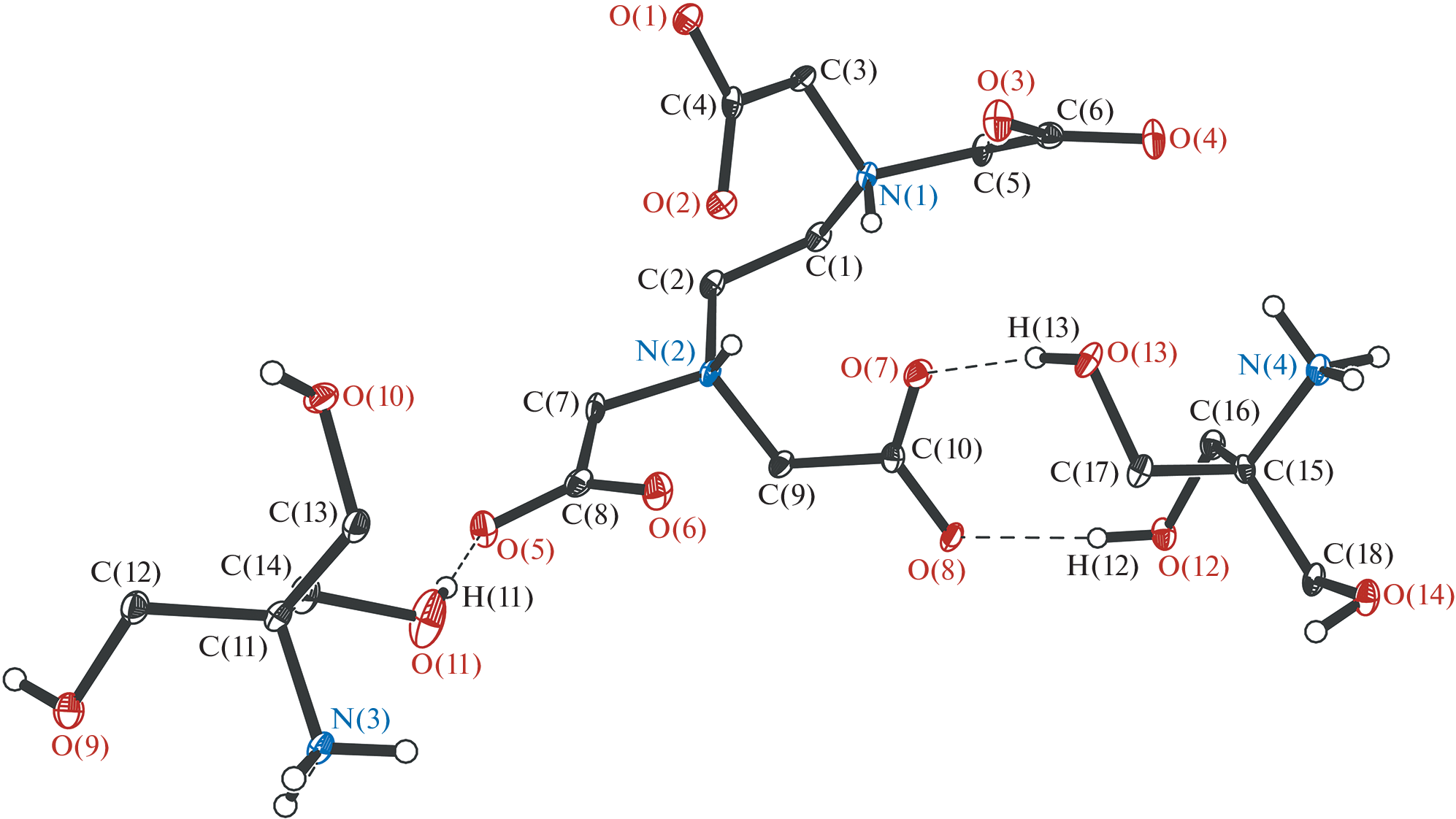 +NH3(CH2)6NH , H2L2–⋅+NH3CH2CH2(OCH2CH2)2NH , H2L2–⋅ +HN(CH2)3NH+⋅H2О, and H2L2–⋅+H(CH3)2NCH2CH2N(CH3)2H+. The molecular structures of bis(monoethanolaminium) ethylenediaminetetraacetate and bis[tris(hydroxymethyl)methylaminium] ethylenediaminetetraacetate trihydrate were determined