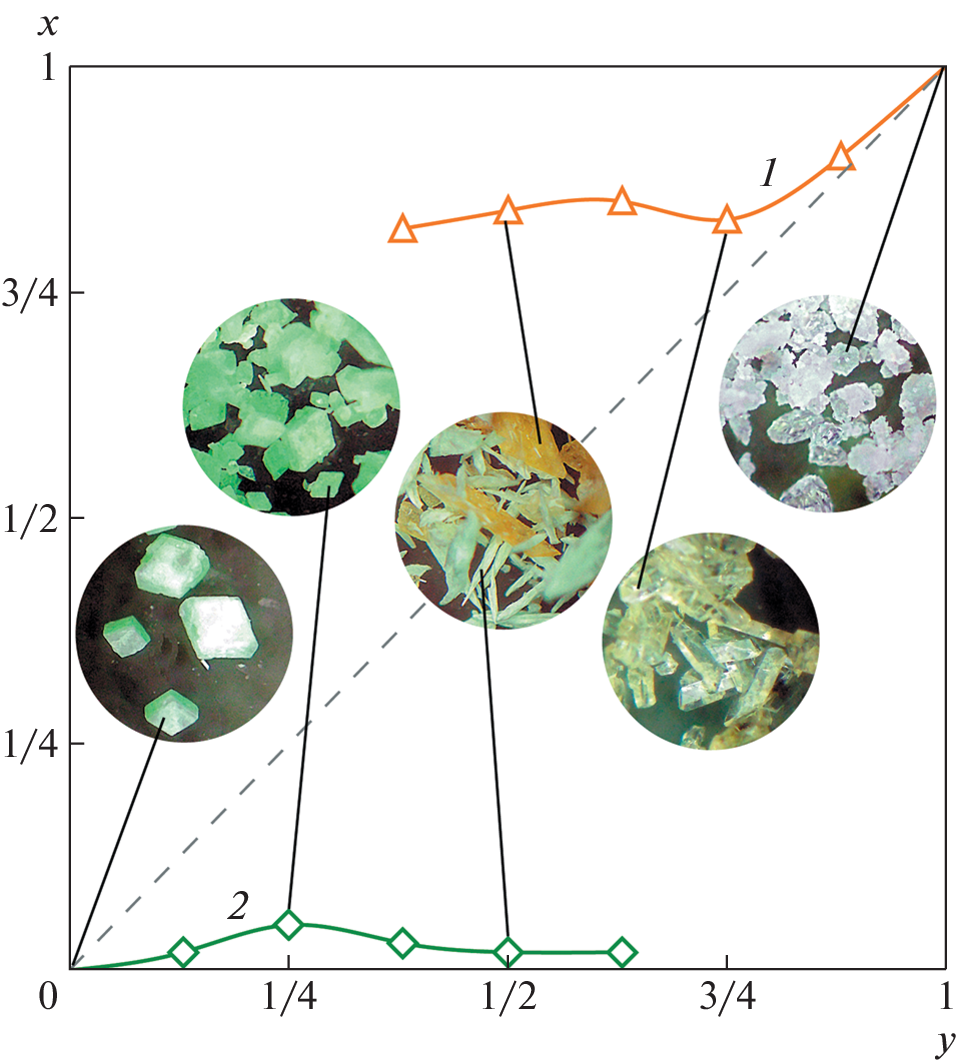 Heterometallic complexes of zinc and nickel with nitrilo-tris(methylenephosphonic acid) Na4[ZnxNi {N(CH2PO3)3}] ⋅ nH2O (x = 0–1) form an isodimorphous substitution series during crystallization. The extreme zinc and nickel terms have, respectively, triclinic and monoclinic structures. The intermediate terms are crystallized in one of the following phases: either in the triclinic phase with dominance of zinc, Na4[(Zn,Ni){N(CH2PO3)3}] ⋅ 13H2O (sp. gr. P , Z = 2, a = 11.171(4)–11.2396(2) Å, b = 11.2612(5)–11.28800(10) Å, c = 12.3241(5)–12.35530(10) Å, α =108.422(4)°–108.4510(10)°, β = 97.1603(16)°–97.1790(10)°, γ = 117.0870(10)°–117.133(2)°) and trigonal-bipyramidal coordination of metal atom, or in the monoclinic phase with dominance of nickel, Na4[(Ni,Zn)(H2O){N(CH2PO3)3}] ⋅ 11H2O (sp. gr. C2/c, Z = 4, a = 11.9987(2)–12.05615(18) Å, b = 18.6231(3)–18.7073(3) Å, c = 21.0758(3)–21.1264(4) Å, β =104.3044(17)°–104.3688(16)°) and octahedral coordination of metal atom. The dependence of the bond angle, type of chemical bonding, and spectroscopic and magnetic properties on the fraction of zinc among complexing metals in the crystal, x = [Zn]/([Zn] + [Ni]), has been studied.