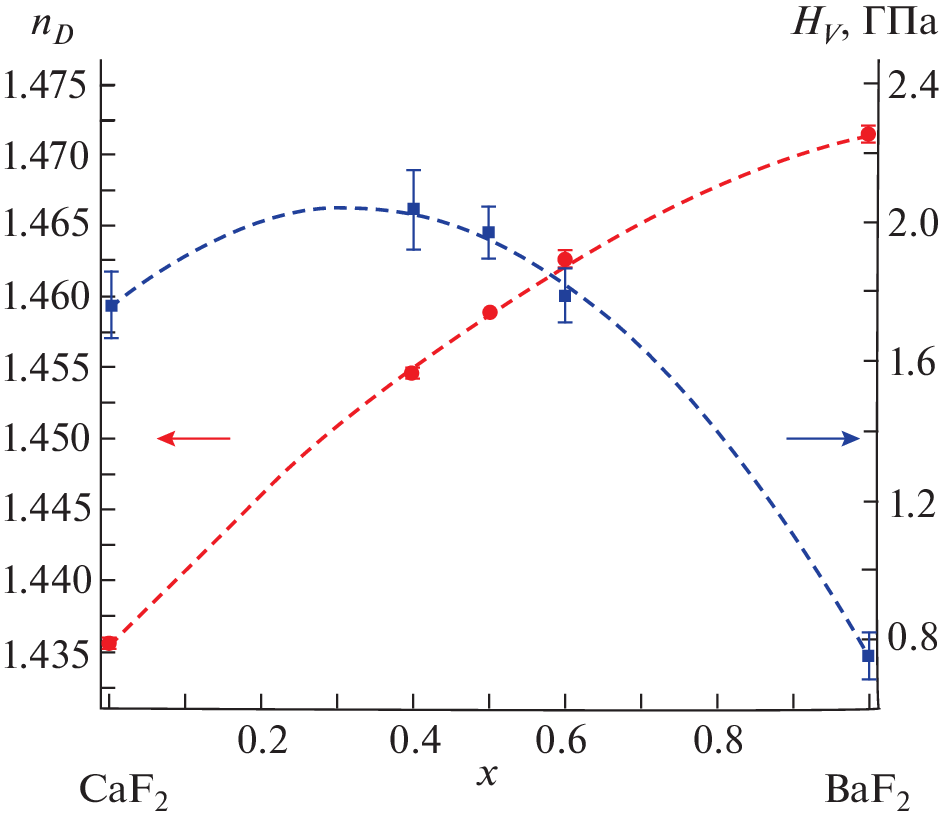 Composite nanomaterials (1 – x)CaF2–xBaF2 with 0.4 ≤ х ≤ 0.6 have been prepared by directional melt crystallization in a fluorinating atmosphere. The structural, optical, mechanical, and electrical characteristics of the synthesized nanocomposites are studied. Biphasic (1 – x)CaF2–xBaF2 composites have a lamellar fine microstructure. The lamella thickness decreases with an increase in the BaF2 content and reaches 30–50 nm for the composition with x = 0.5. The composites retain high transparency in the IR range (close to the values for the initial components). The microhardness (НV ≈ 5.0 GPa) and ionic conductivity (σdc = (1–3) × 103 S/cm at 823 K) of these composites exceed significantly the corresponding parameters of CaF2 and BaF2 crystals. The fluoride nanocomposites under investigation are promising materials for practical applications in photonics and solid-state ionics.